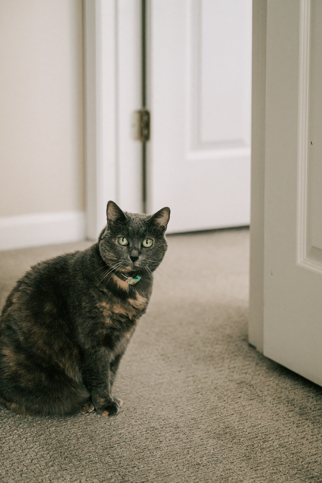 I walked in the door and was greeted by a rambunctious, energetic corgi. I went up the stairs and was greeted by this adorable smiley 2 month old and her parents. She was so easy-going and definitely awake and interested in everything going on, especially her fur doggie brother and two kitty sisters.